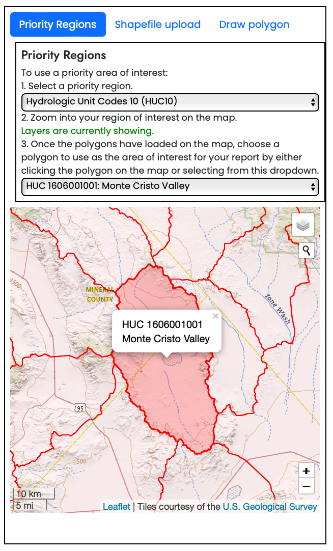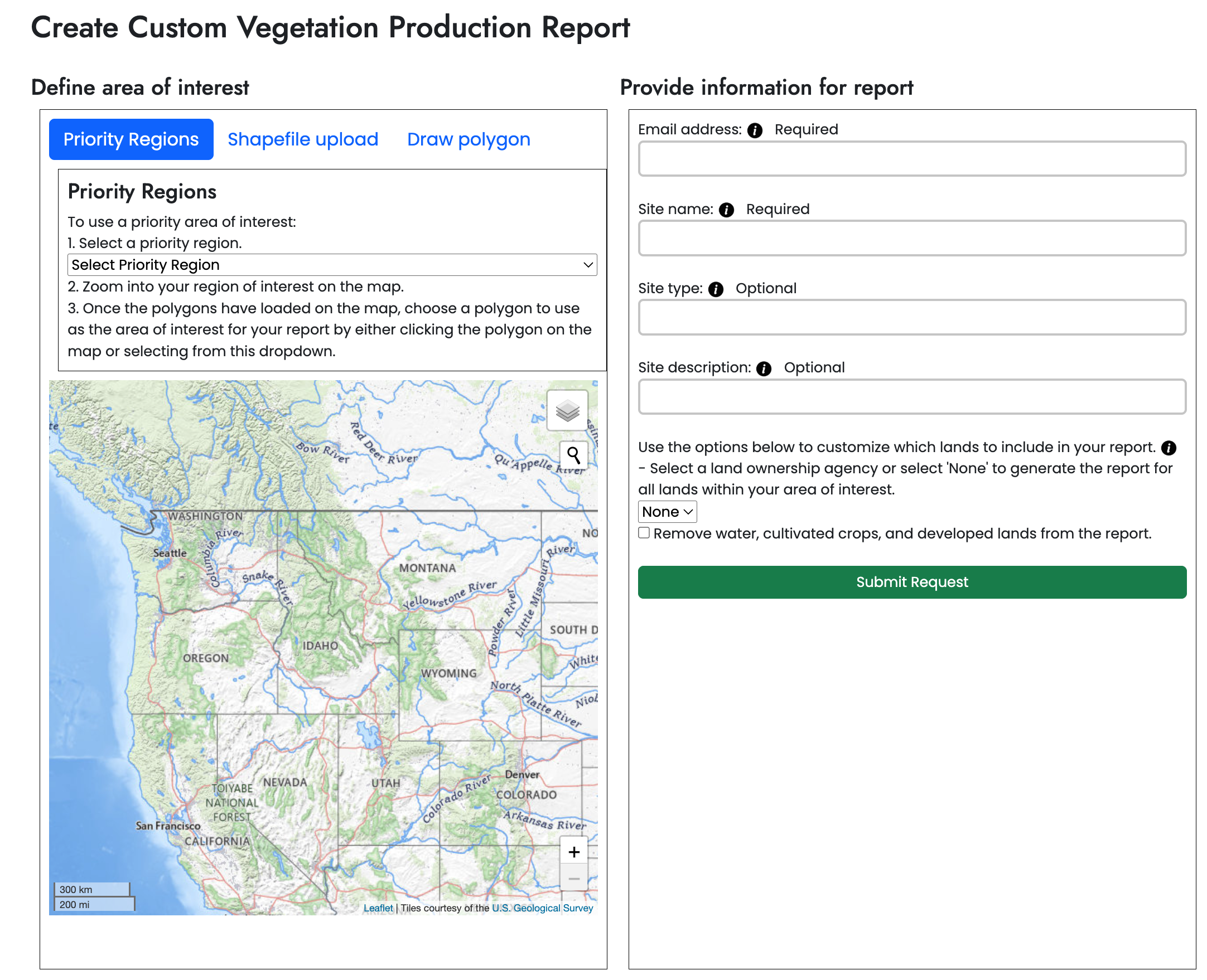 There are three 'areas of interest' options to select an area to generate a report for. The first option is selecting a 'Priority Region'. These are pre-loaded regions that may be of interest to a variety of users. When one of the 'Priority Region' datasets is selected, the regions are added to the map on the left of the UI. For some regions, you may have to zoom in further to see them. To select an area within the 'Priority Region' you can either utilize the drop-down or click on the area in the map. Once you select an area, the Site Name will be updated on the right side of the UI.