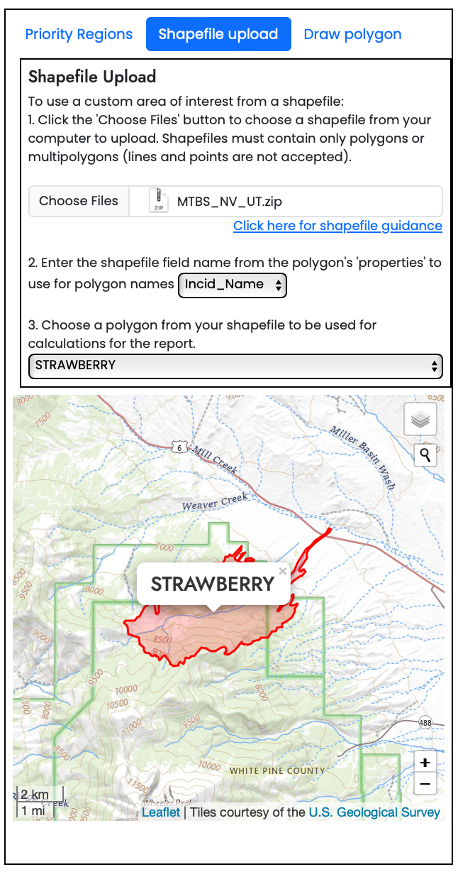 The second option is uploading a shapefile. To use this option, click on 'Shapefile upload' and you will see the left panel update to allow you to upload the shapefile. First, click on the 'Choose Files' and select either a zipped shapefile or all of the individual components of the shapefile. Next, you will need to select the field name from the polygon's 'properties' to use for polygon names to choose from. Similar to the 'Priority Regions', to select an area within the shapefile you can either utilize the drop-down or click on the area in the map. Once you select an area, the Site Name will be updated on the right side of the UI.