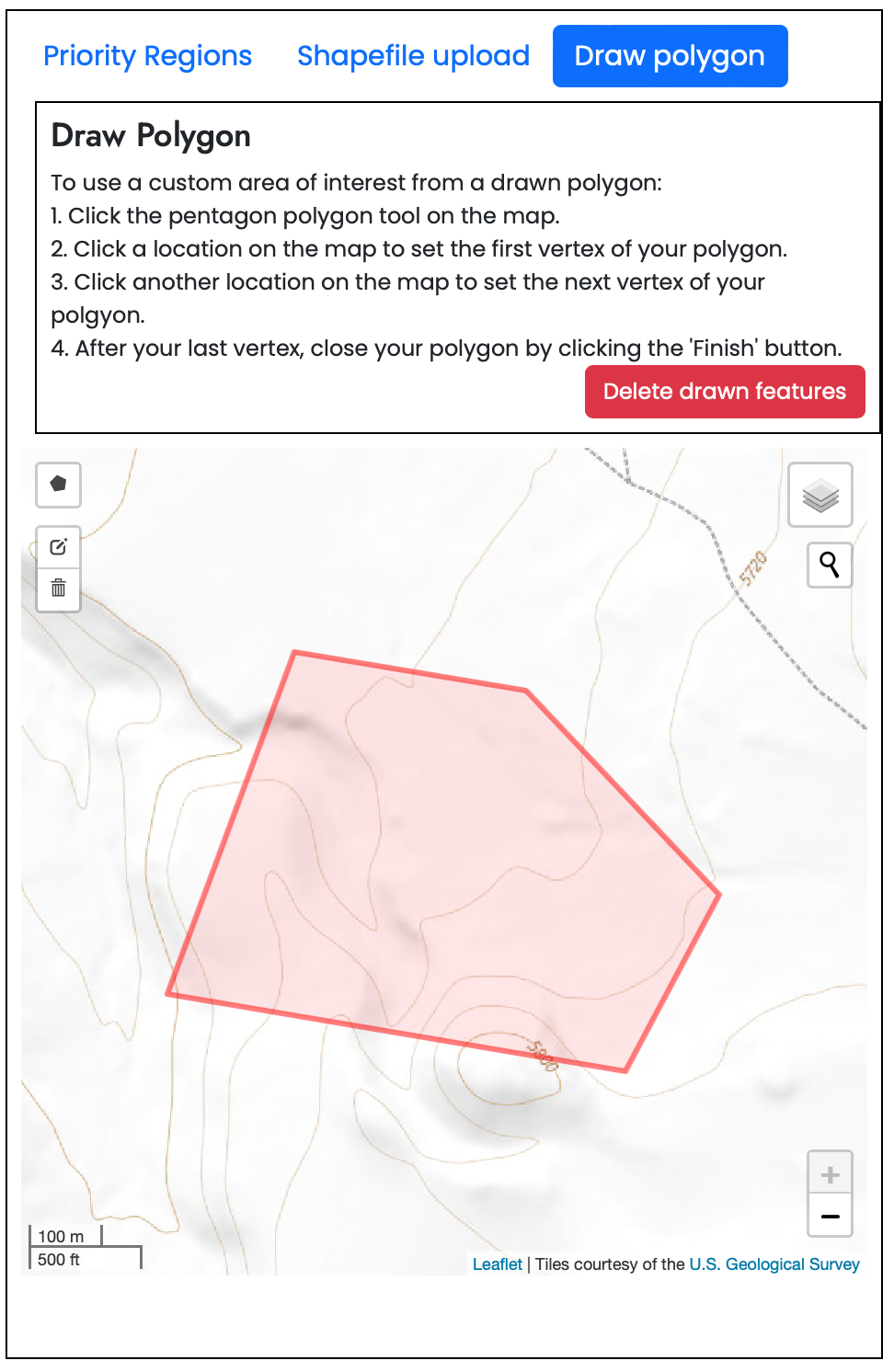 The third option is drawing a polygon. To use this option, click on 'Draw Polygon' and you will see the left panel update with a pentagon polygon tool being added to the top left-hand side of the map. By clicking on this tool, you can draw and set of vertices to create your custom drawn polygon. Remember to close the polygon by either clicking on your first vertice or clicking the finish button which is available while drawing the polygon to the right of the pentagon polygon tool. If you need to edit the polygon, you can click on the little box with a pencil which is located right under the pentagon polygon tool and above the trash can on the map. If you want to delete your drawn features to start over, you can either click the red 'Delete drawn features' button in the directions section or utilize the trash can on the map.
