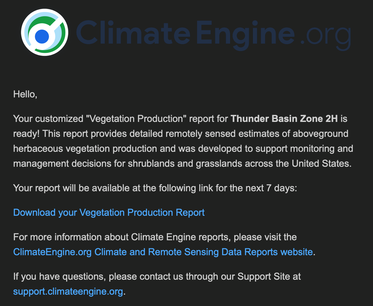 The email will come from no-reply@climateengine.org and the subject line will reference the 'Site name' you provided. For this example, the subject line is 'Your Vegetation Production Report for Thunder Basin Zone 2H is Ready!'. All you have to do to access your report is click 'Download your Site Characterization Report' and a folder containing the underlying data, the images, and reports will be downloaded.