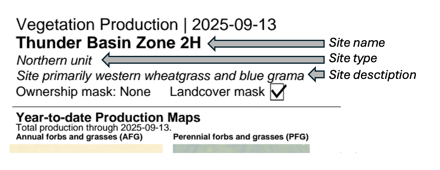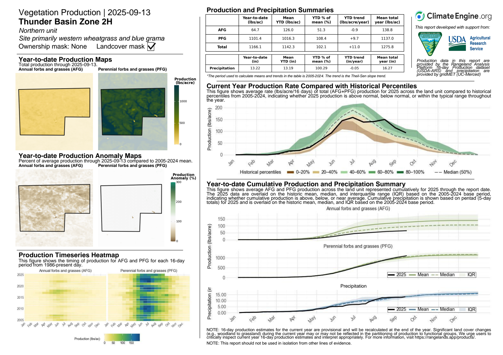 For the Vegetation Production reports, the underlying data is the timeseries values for RAP Vegetation Production and gridMET precipitation CSV format. The images are PNGs of each of the figures in the report. The reports are available in both PNG and PDF format. At the bottom left hand of the report, the datasets used to produce the figures and the date the data is from are noted.