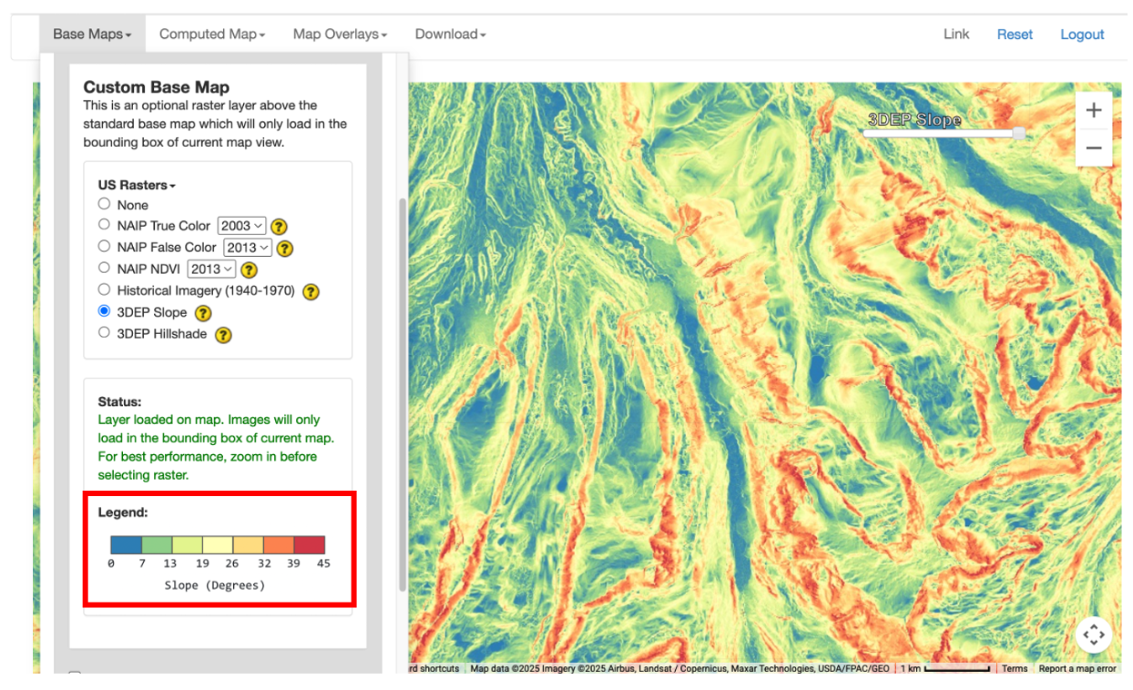Here you will see toggles for the different raster options. The default is set to None. To learn more about each data option, click on the (?) next to the layer. This will direct you to a documentation page. You can only select one option at a time. Then click the circle next to the layer of interest to turn it on. This will add the layer to the map above any base maps or computed maps. The Legend will appear below the Status section.