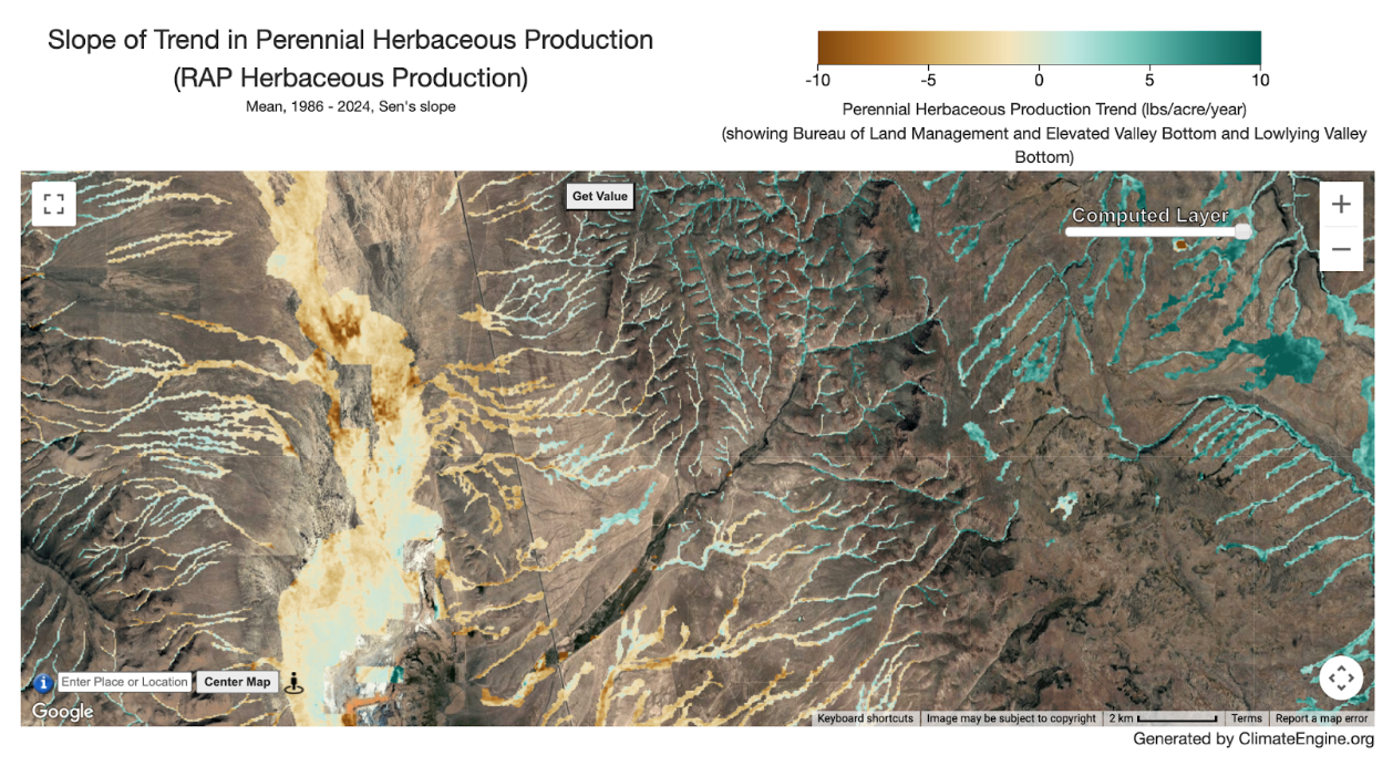 The new categorical raster masking functionality applies to both maps and graphs made in Climate Engine and allows users to subset their computed map layers and timeseries analysis based on categorical datasets such as land ownership, landcover, or wetland types. For example, users can now subset their maps of summer Normalized Difference Vegetation Index (NDVI) trends to Valley Bottom Extraction Tool (VBET) extents, allowing riparian assessments to be masked to predefined valley bottom areas across broad regions—without the need to manually upload or draw polygons.