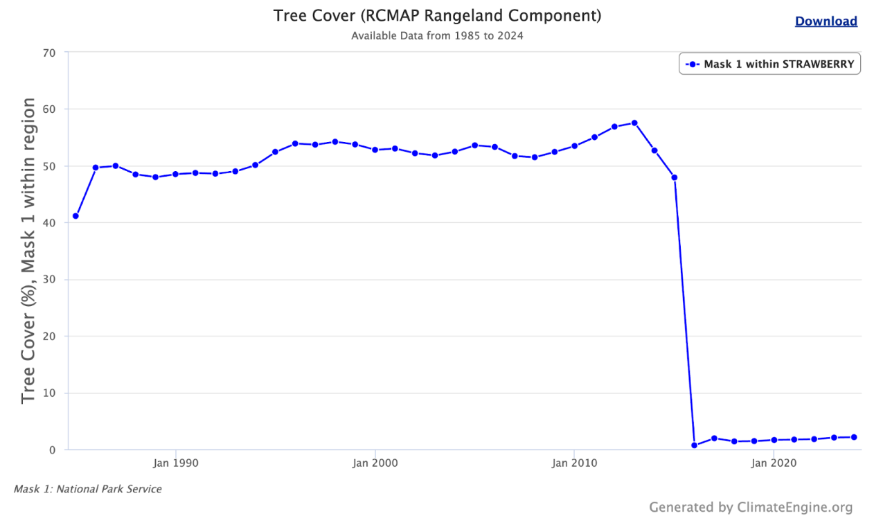 Fig 14. Graph of RCMAP Annual Tree Cover % within Strawberry Fire perimeter on NPS lands.