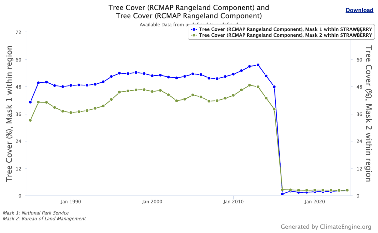 Fig 15. Graph of Annual Tree Cover % within Strawberry Fire perimeter on NPS vs BLM lands. The